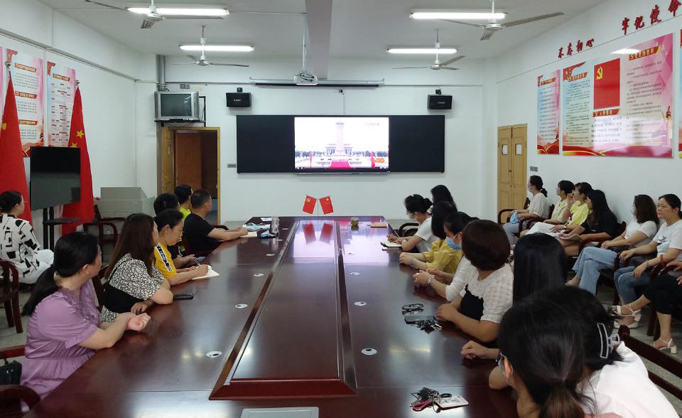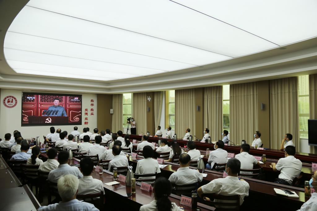 (本网记者:吴春花)庆祝中国共产党成立100周年大会于7月1日上午8时在北京天安门广场隆重举行,中共中央总书记、国家主席、中央军委主席习近平发表重要讲话。为深入学习习近平总书记重要讲话精神,学校组织师生集中观看了庆祝中国共产党成立100周年大会现场直播。学校党委理论学习中心组全体成员、各二级单位党政负责人在西区文德楼二楼会议室进行集中观看,各二级单位教职工在各办公室、教研室、教室等地方进行集中观看。
