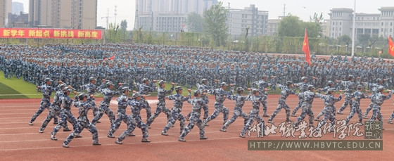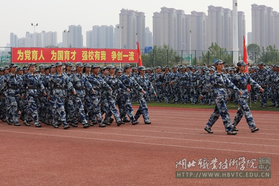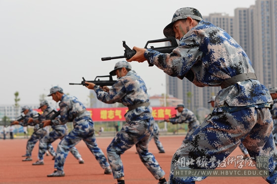 伴随着雄壮的中华人民共和国国歌,五星红旗冉冉升起。随着党委书记郭国文一声令下,军训汇报表演开始,各军训学员方队迈着整齐的步伐陆续经过主席台,赢得了全场的阵阵掌声,分列式后,军训学员表演了捕俘拳、捕俘刀、战术基础动作。